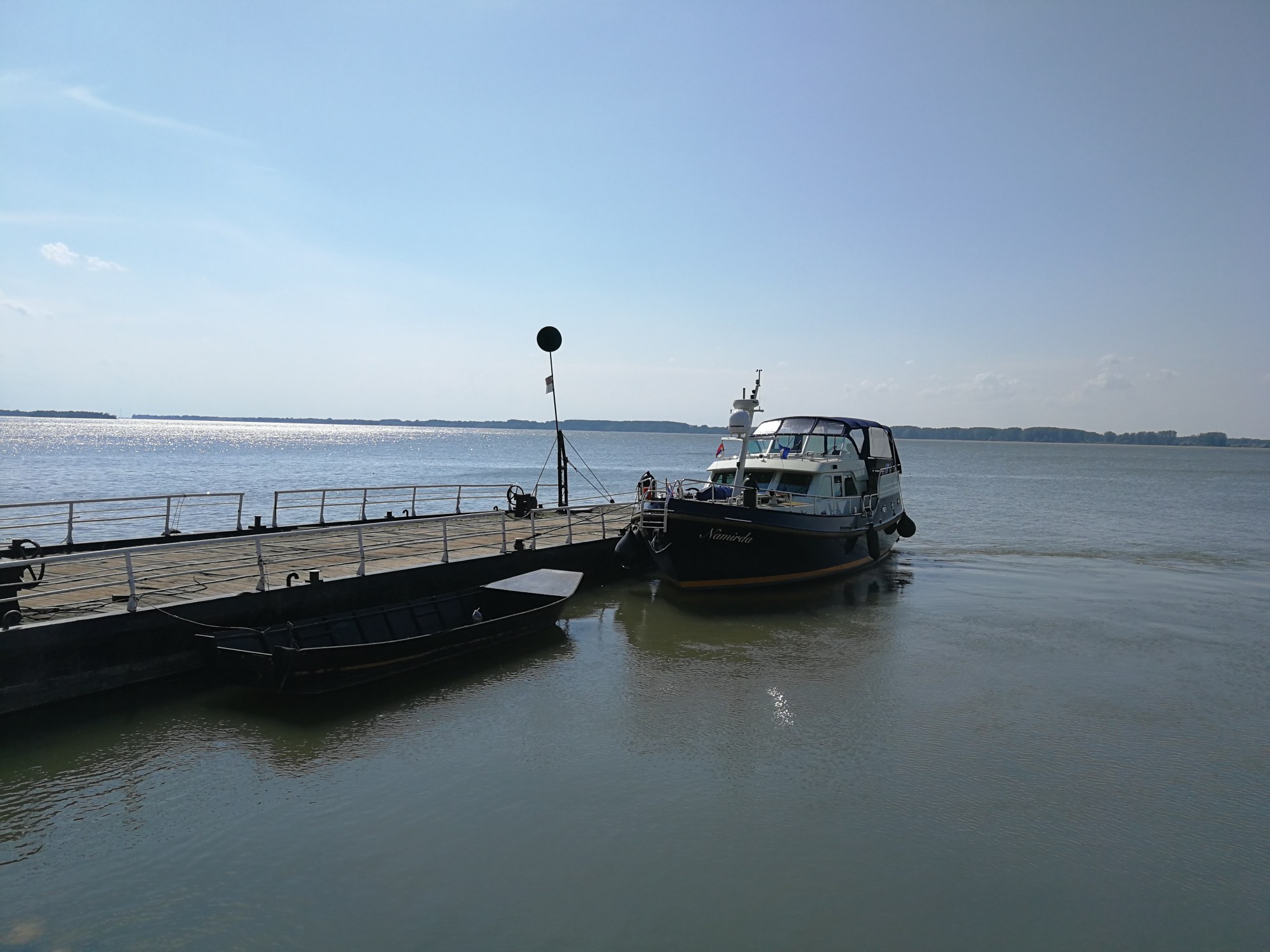 Namirda lief sauber durch die Wellen, wir hatten einen Vorgeschmack auf das Meer, aber die Aussicht, bei diesem Wind, der laut Wetterbericht die ganze Nacht und den nächsten Tag so weiter blasen sollte, die Nacht im Strom vor einem Zollpoton zu verbringen, war nicht sehr erfreulich und wir haben beschlossen in der windgeschützten Bucht vor Ram vor Anker zu gehen. beim näheren Hinfahren haben wir dann einen ausgemusterten Fährpoton entdeckt, und gegen den Wind und gegen den Strom mit ziemlich waghalsigen Manövern und vollem Einsatz endlich dann doch festgemacht.