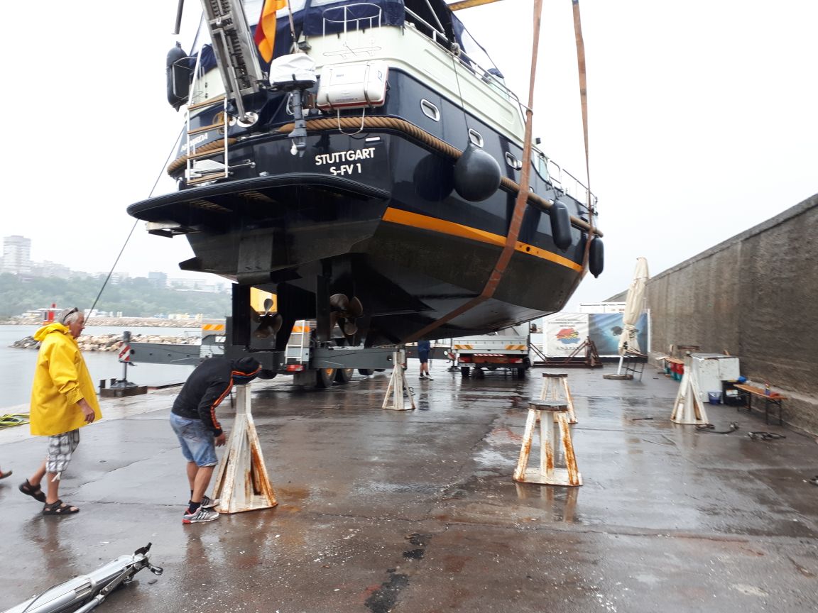 Wir waren innerhalb 2 Stunden im strömenden Regen aus dem Wasser und aufgeständert, etwas Schräglage, aber das lies sich nicht mehr ändern.