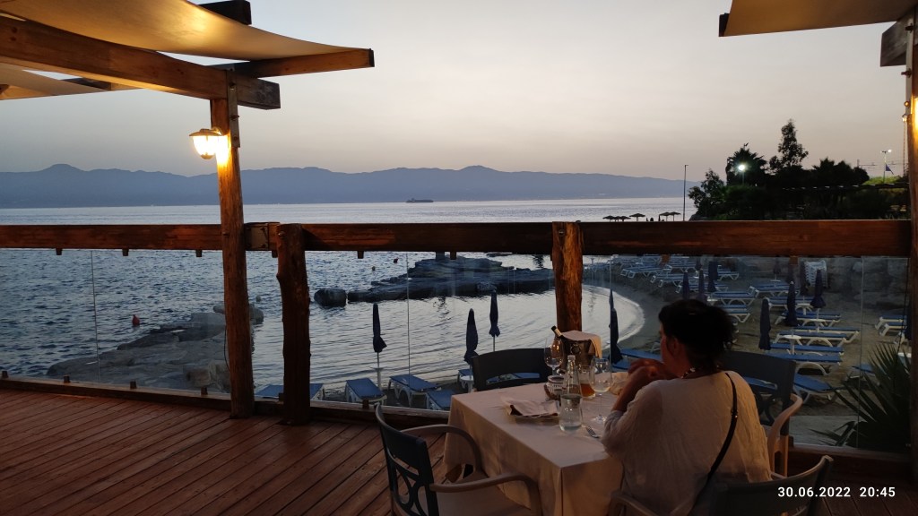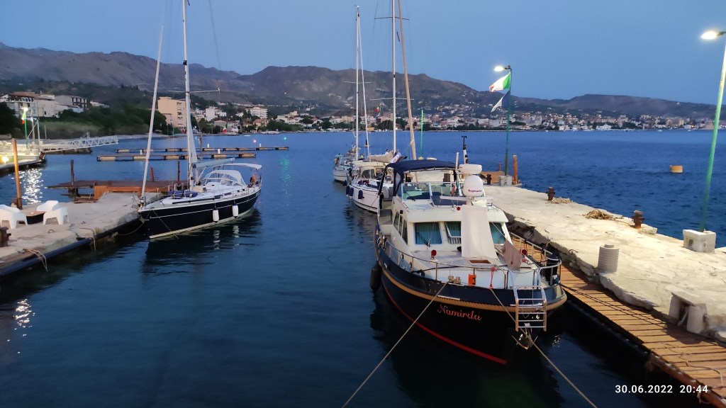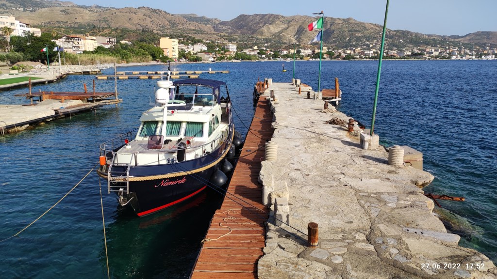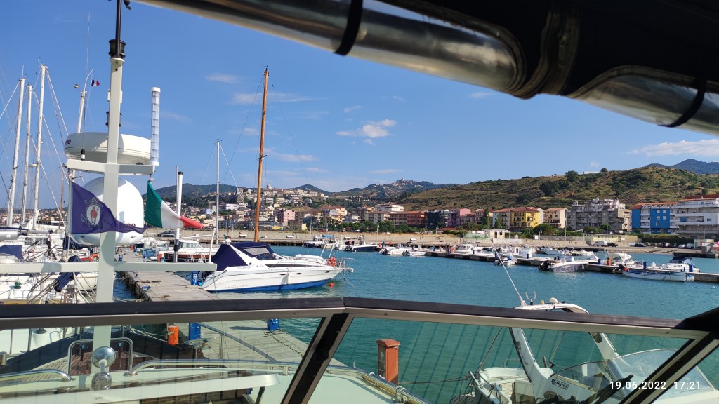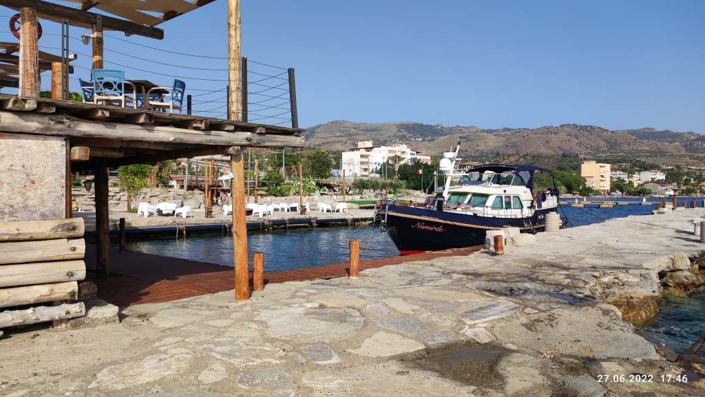 und dann kamen wir nach Balaro, eher ein Resort als ein Hafen, gebaut von einem Architektenkollegen, das Wasser im Hafen klar wie ein Pool, man darf auch vom Schiff aus schwimmen, es gibt eine Liegewiese, Strandliegen zwei Restaurants und eine Einkaufsmall mit eigenen Hafeneinkauftrollys. wir haben es sehr genossen und schöne Abende verbracht, einschließlich eines Ausflug mit dem Bus nach Reggio Calabria.