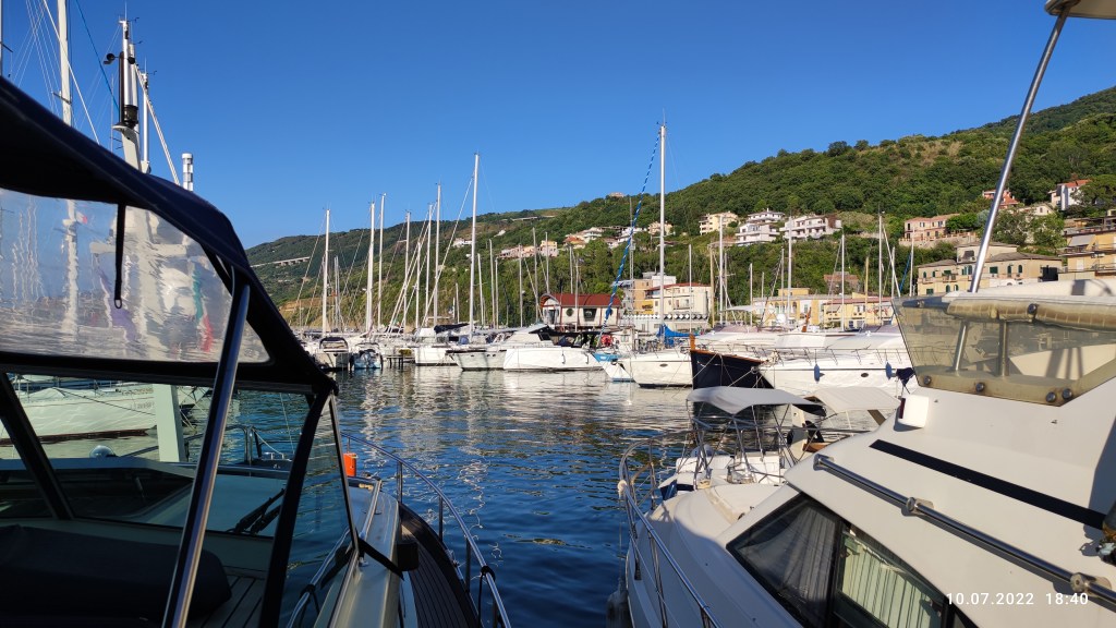 Also wieder ins Büro zu Alexandra, die ruft Emanuele, den Elektriker an an, der dann auch ziemlich schnell da ist. Karlheinz bespricht als erstes natürlich den SB Motor, es geht Ihm ziemlich auf die Nerven immer nur mit einem Motor anzulegen, ohne Wind kein Problem, mit Wind von der falschen Seite eben schon. Wieder hören wir, das braucht einen Techniker von Volvo Penta, Alexandra hat Ihn gleich organisiert, kommt aber erst morgen.